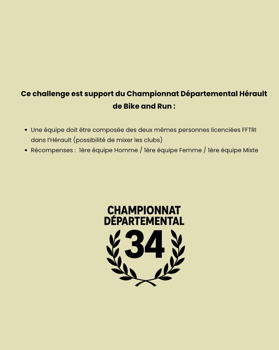 En effet, ce challenge format S est support du championnat Départemental de Bike and Run de l’Hérault, seule contrainte : les deux équipiers doivent avoir une licence FFTRI compétition dans un club de l’Hérault et participer au maximum de manches pour être le mieux classé!